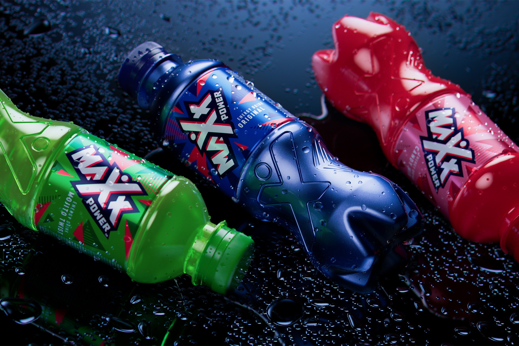 We began the project by focusing on a key idea: to shape energy. The structural design we developed is a real game-changer, blending aesthetics and functionality in one bold and eye-catching gesture. An "X" sculpted on the surface dominates the centre of the bottle, a clear reference to the Maxx Power logo, which not only reinforces the visual identity but immediately conveys feelings of movement, impact, and speed.